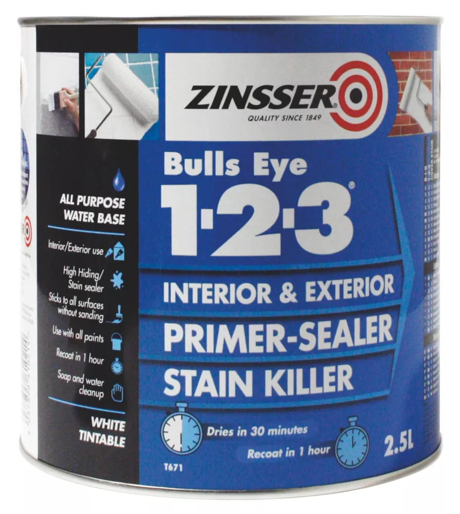 Interior and exterior, water-based, primer / sealer. Adheres to all surfaces without sanding. Blocks stains, permanently sealing graffiti, grease spots, tar and asphalt, indoors and out. Low odour application and conveniently quick-drying with excellent adhesion to even glossy surfaces. Contains a biocide that protects the dried coating against fungal degradation. Dry in 30 minutes. Recoat in 60 minutes.